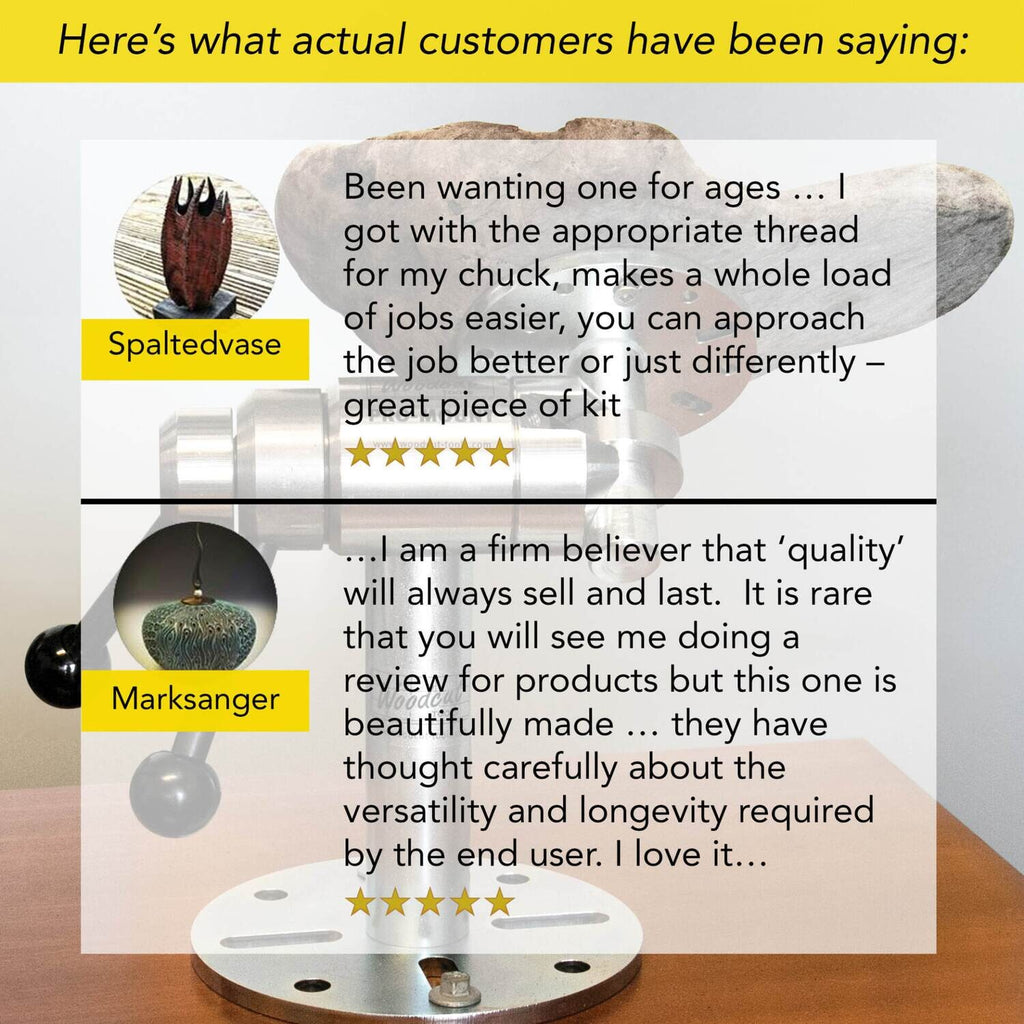 This is far more than a carving stand. Choose the correct spindle for your lathe and this gives you the option of mounting a woodturning chuck with the same thread onto the Pro-Mount. Turners can screw a freshly turned bowl directly onto the Pro-Mount for embellishment and decoration while the bowl is held in the jaws of the chuck. The Pro-Mount is precision machined from 1045 high tensile steel.